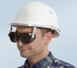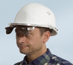 | Die Klappbrillen werden direkt am Helm befestigt. Dadurch hat der Arbeiter seine Schutzbrille "immer dabei". Besonders in gefährlichen Arbeitsbereichen sind die Augen dadurch immer geschützt. Bei Bedarf kann die Klappbrille hochgeklappt werden. Die Brillengläser sind auswechselbar und es können Schutzfilter für die verschiedensten Einsatzzwecke (z.B. Athermal- oder Neothermgläser) verwendet werden. | |